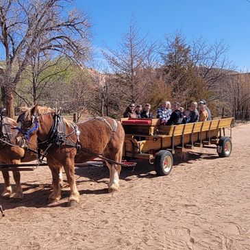 Our horse-drawn wagon rides feature Bill and Boone, a team of pure-bred Belgian draft horses. Our wagon holds up to 16 people and is available for weddings, family reunions and other special events.